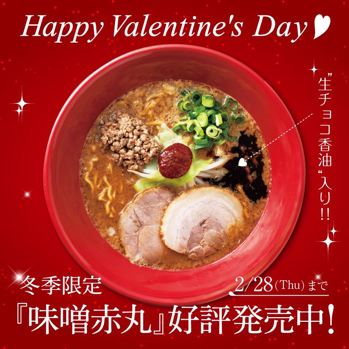 明日は #バレンタインデー ですね。バレンタインとは縁のなさそうな一風堂ですが、実は冬季限定「味噌赤丸」の香油に、ベルギー産を含む数種のカカオに生クリームを合わせた生チョコをブレンドしています。ラーメンの中に、ほんのり香るチョコの風味をお楽しみください🍜