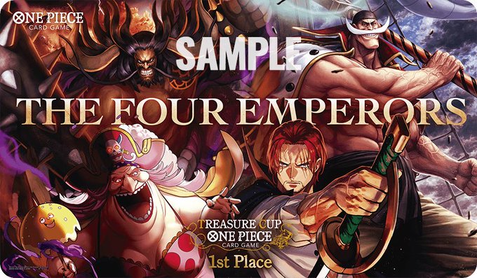 海外のワンピカードの大型大会で優勝すると四皇、準優勝で七武海のプレイマット、ベスト8でシリアルルフィがもらえるらしい、、