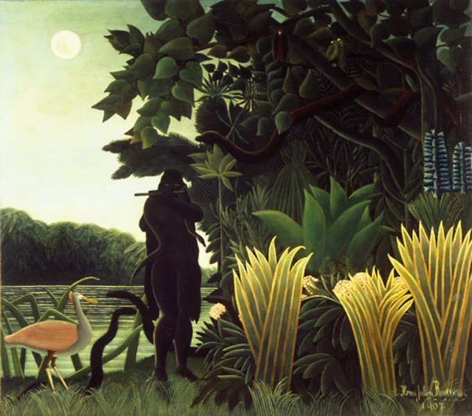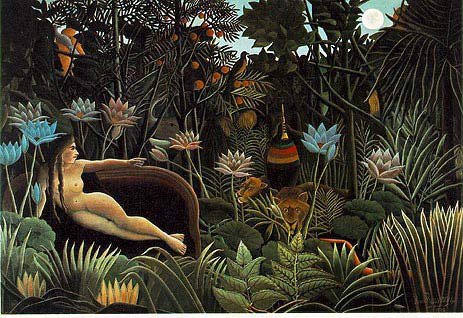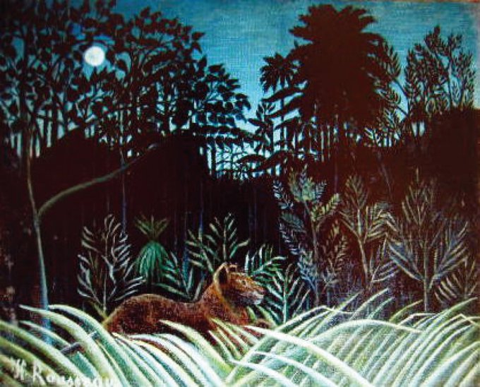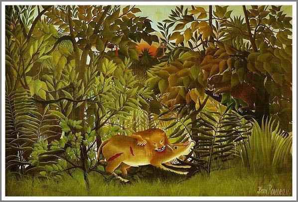 パリの画家アンリ・ルソー 異国のジャングルや森の中を描いていることからナポレオン4世のアフリカ遠征に同行したなどとうわさされていたが実際には近所の植物園でのスケッチとお気に入りの動物写真集と旅行をしてきた知人の話を参考に描いていた。