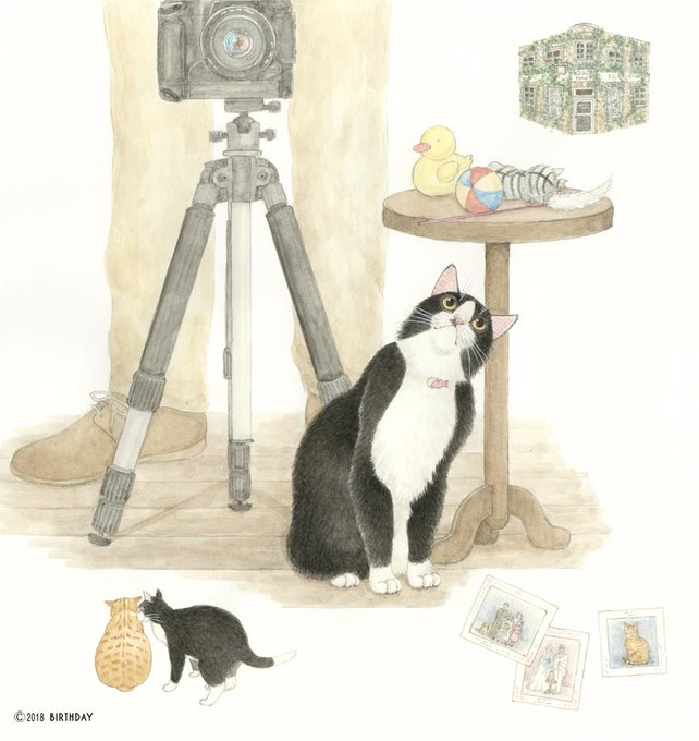 ピスフール公園の近くにあるMr.フィンリーの写真館。動物写真もプロ級のご主人様と、アシスタント猫のミシェットのおかげで“我が家の、猫と家族の成長の記録”として写真を撮ってもらいに来るお客さんが絶えません。撮影拒否の猫にも、そっと近づいて話しかけます。 #猫イラスト