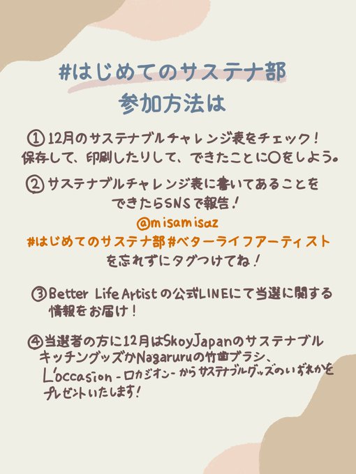 @AlissaMiky アリッサ氏に協力してほしいことがあるのだ!わたしが企画している #はじめてのサステナ部 は季節と文化に合わせてサステナブルなアイディアをイラストにしたものなの!サステナブル・SDGsとかを楽しく生活に取り入れてほしい気持ちでスタート。もし共感してもらえたら、参加してくれたら嬉しいよ!