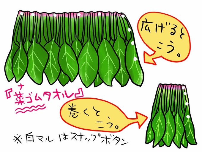 『菜ゴムタオル』…ほうれん草(菜っ葉)デザインの、ゴムが入ったタオルです。くるっと体に巻いてボタンを留めれば、あなたも立派なほうれん草!