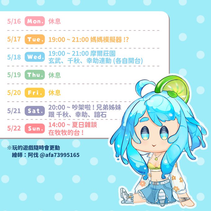 啵啵下午安✨4本週週表 💙5/16~5/22週表💙 二 [5/17] 19:00~21:00 媽媽模擬器 三 [5/18] 19:00~摩爾莊園 跟玄武、千秋、幸助 (各自開台) 六 [5/21] 20:00~吵架啦兄弟姊妹!主題雜談 跟諳石、幸助、千秋 日 [5/22] 14:00~ 夏日氣泡雜談 ! 跟牧牧一起 在牧牧的頻道 ! #手打_live