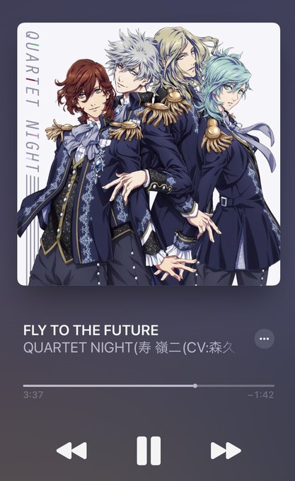 #nowplaying FLY TO THE FUTURE by QUARTET NIGHT(寿 嶺二(CV:森久保祥太郎)・黒崎蘭丸(CV:鈴木達央)・美風 藍(CV:蒼井翔太)・カミュ(CV:前野智昭))