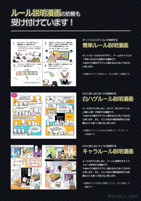 イラスト、デザインの他にもルール説明漫画の依頼も受け付けています。不明点などありましたらDMやリプライでお気軽にご相談ください!
