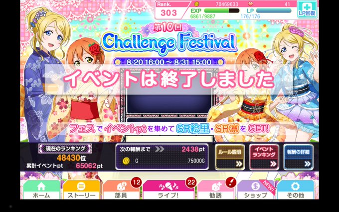 改めて……、チャレフェスの結果は、イベランはギリギリ2枚取れて、スコアランキングもギリギリSSシール取れたヽ(*´∀`)ノ