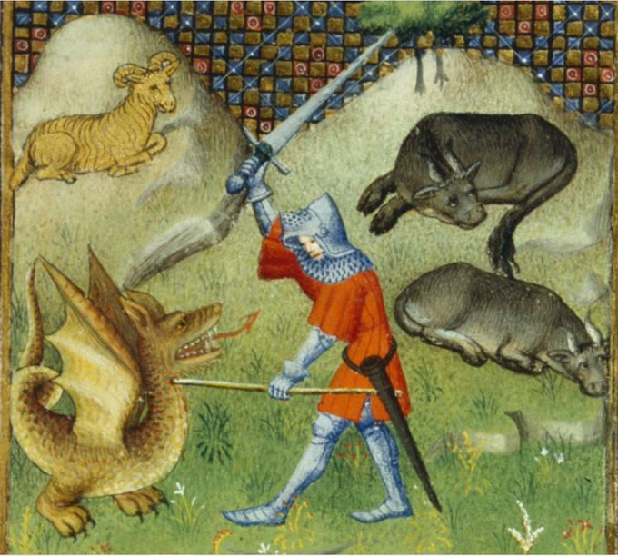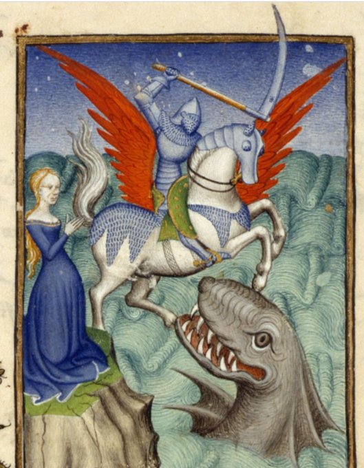 中世の写本には幻獣ドラゴンがよく描かれる。しばしばとてもユーモラスに。竜はギリシア起源だ。dragonという言葉が西洋に初めて出現したのは1225年のこと。キリスト教では悪魔と見做され、人間の敵であるので、滅ぼすか教化すべき対象となった。大天使ミカエルや聖ゲオルギウスの竜退治は有名である。