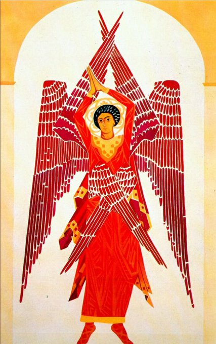 ナタリア・ゴンチャロワはロシア・アヴァンギャルド期の1910年台にキリスト教的テーマの絵やリトグラフを多く制作した。写本にも描かれた熾天使(最初の絵が写本のもの)、第一次世界大戦の時には聖ゲオルギウスの竜退治のリトグラフを描き、X字型の十字架で処刑された聖アンデレも躰の向きで表現した。