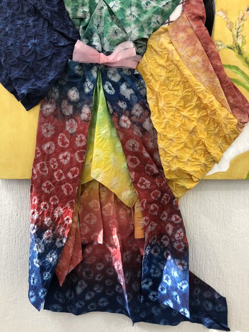 絞り染めは白地、薄水色、薄ピンク色の布を赤青緑黄の4色の染料で染色しました。