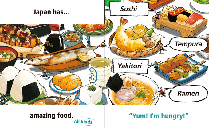 富士山、和食、人口、歴史、アニメ・マンガ、マナー、四季、日本語についてユーモアいっぱいのイラストで描かれていて、とっても素敵な絵本になっています😆🤲