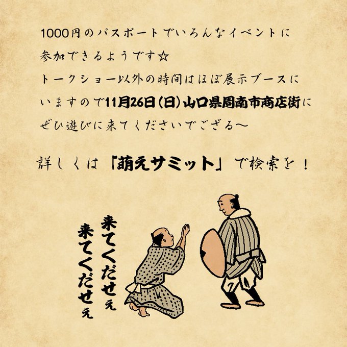 山田全自動まさかの萌えイベントに参戦‼️11月26日(日) 山口県周南市徳山商店街で開催の『萌えサミット7(セブン)』で作品を大量展示!14時からはトークショーも行います✨グッズの販売もあるでござる🌝 詳しくはこちらをチェック‼️→https://t.co/20Nt994W32