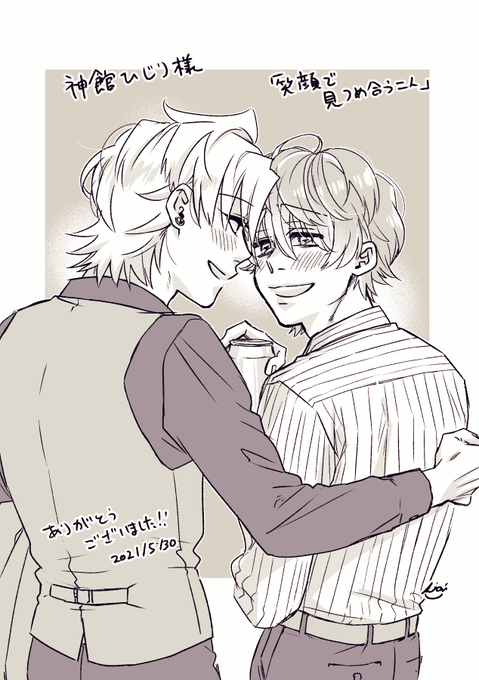 当アンソロジーに参加してくださった、64パン様(64panman_des)よりカウントダウンイラストをいただきました! 夕暮れの事務所で揃いのスーツでめかし込む二人…これからパーティにでも行くのでしょうか…😳優しく見つめ合う二人にぐっときます!