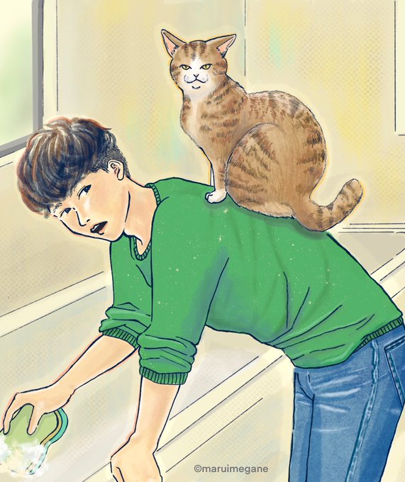 訪問介護勤務のとき、訪問先の方が猫と暮らしていて、お風呂掃除の時はよく背中に登ってきてくれていたなーって思い出を描きました。