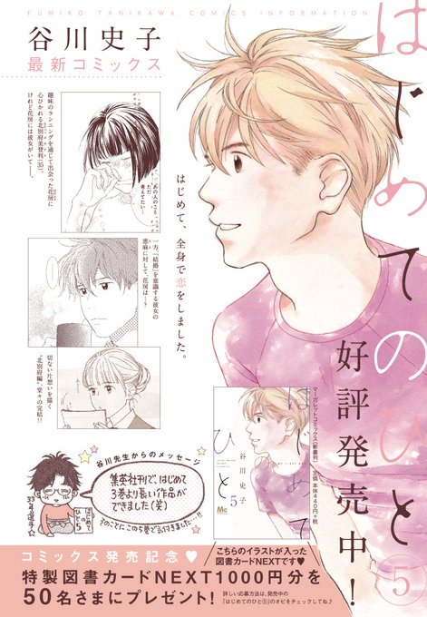 谷川史子最新刊! 「はじめてのひと」5巻、今日発売です💜 切ない片想いを描く<北別府編>、ついにクライマックス…! オビについてくる応募券で図書カード1000円分が当たるプレゼントも実施中😍 お見逃しなくです❣ 谷川先生からのメッセージもいただきました。2枚目の画像をご覧ください♪
