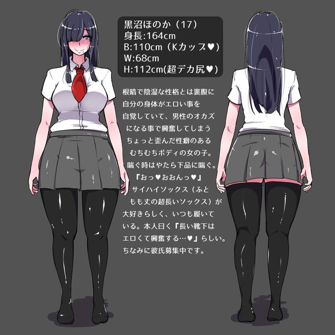 黒沼ほのかの設定画描きました~。お尻がデカ過ぎてスカートが持ち上がっているので、後ろから見るとサイハイソックスをはいているのが分かります。
