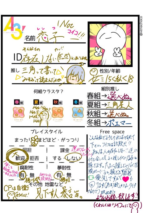 A3!の他にも色んなジャンルに足をつっこんだり、絵を描いたりしてます。通話したり落ち着いた頃に遊べたり…たくさん絡める友達を探してます🥺