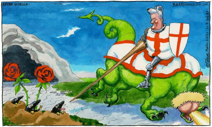 La parodia de @BellBelltoons de 'Historia de San Jorge y el dragón' (ca. 1470) de Paolo Uccello con #KeirStarmer #Labour en el papel del santo