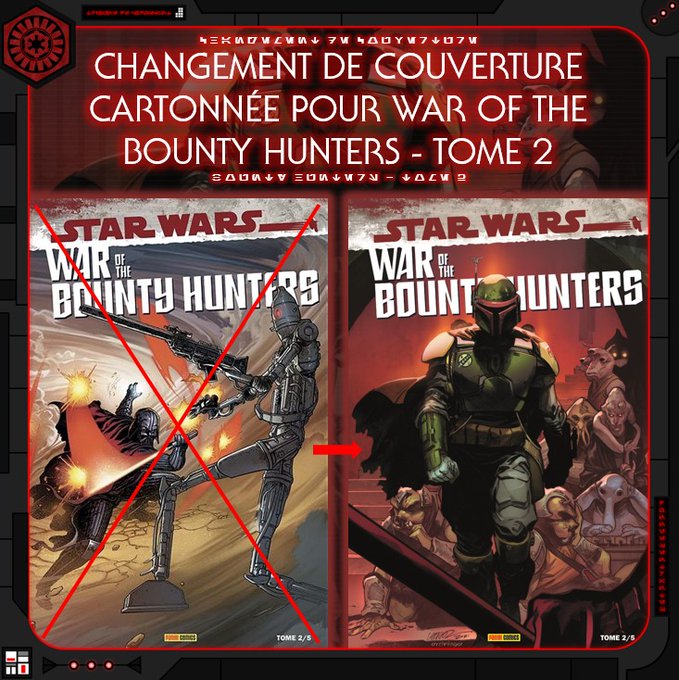 Le 2e tome du crossover de comics War of the Bounty Hunters sort demain en français et @paninicomicsfra a annoncé un changement de couverture pour l'édition cartonnée du numéro !