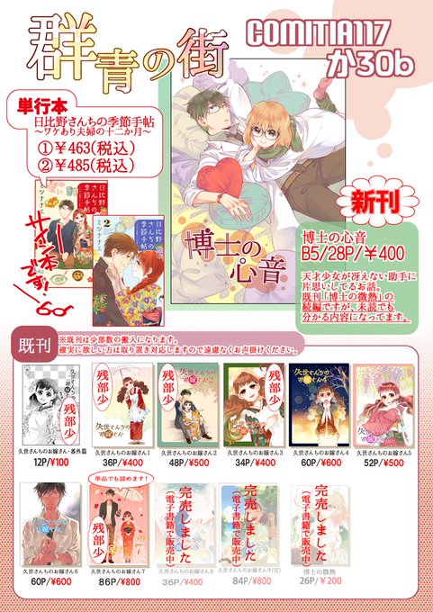 明日のコミティア「群青の街」か30bにて参加です。詳細はPixivを→https://t.co/ue2xfKHXQR 単行本・日比野さんちをスペースまで持参頂けましたらサインしますのでお気軽にヽ(´▽`)ノ #COMITIA117