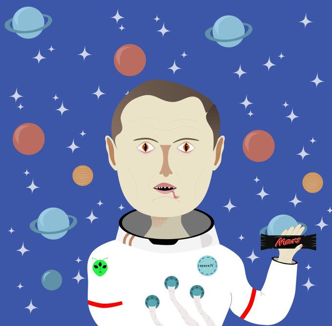 The genius turned out to be reptilians, this explains the connection with the cosmos. Elon Musk is a repiloid, in an astronaut suit, holding a Mars bar in his hands, an analogy with the colonization of the planet Mars. #NFTCommunity #NFT