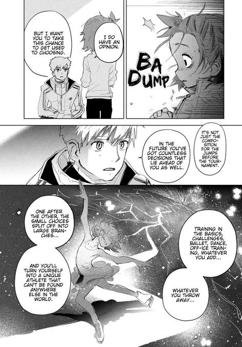 so refreshing to have a manga that focuses on a mentor. medalist shows us that this mentorship is a two-way communication and coaches have to respect their athletes' decisions and support them in the best way they can. tsukasa, despite being new, seems so natural at this job