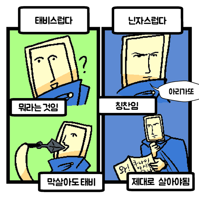 개인적으로 태비가 지구를 구한 이후에 태어난 인간들은 적어도 면상은 펴지 않을까()