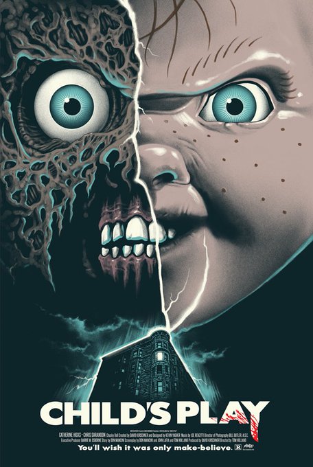 "Hi, I'm Chucky, and I'm your friend till the end. Hidey-ho!" Child's Play (1988) fan poster is two faced #posters #horrorposter #poster #horrorfilms