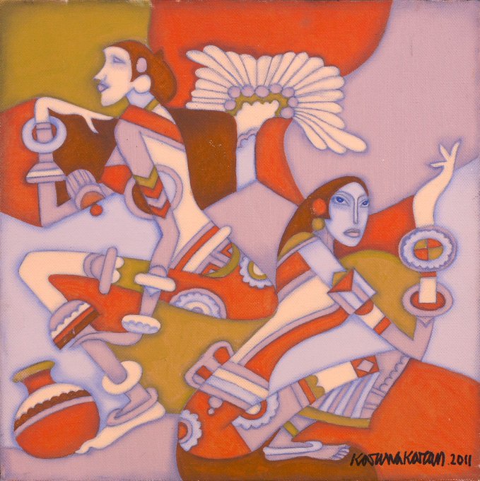 figure. Instead, the hand, the 'Mino hand' with the typical highly curved thumb, holds a disembodied head-g the artist's head-g with all the plasticity and dimension of flesh and paint. The colours scheme of teal, turquoise, pink and red is repeated in the series, but here, the+