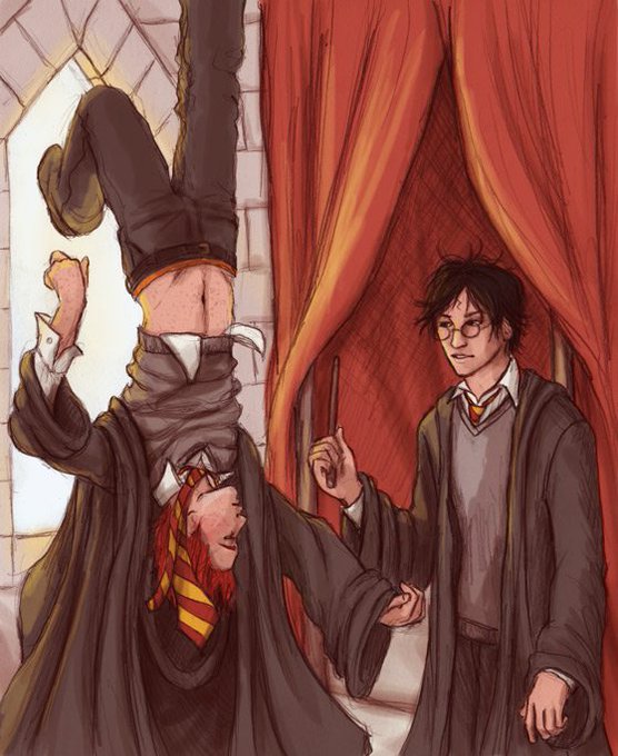 "Harry sent Advanced Potion-Making flying in panic; Ron was dangling upside-down in midair as though an invisible hook had hoisted him up by the ankle.