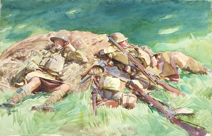 American artist John Singer Sargent's watercolour of WWI Highlanders resting at the Front 1918 #IndependenceDay