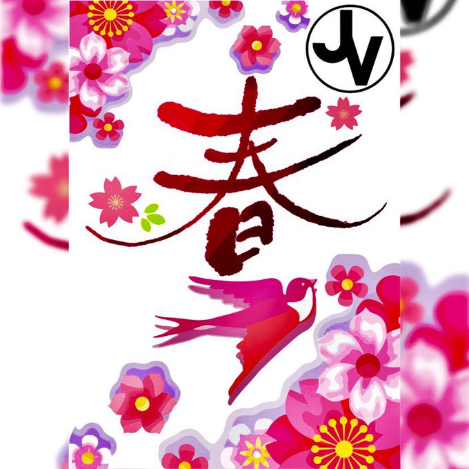A color variation of pink sakura flowers, a large bird flying from the horizon and a single kanji letter in the centered position.