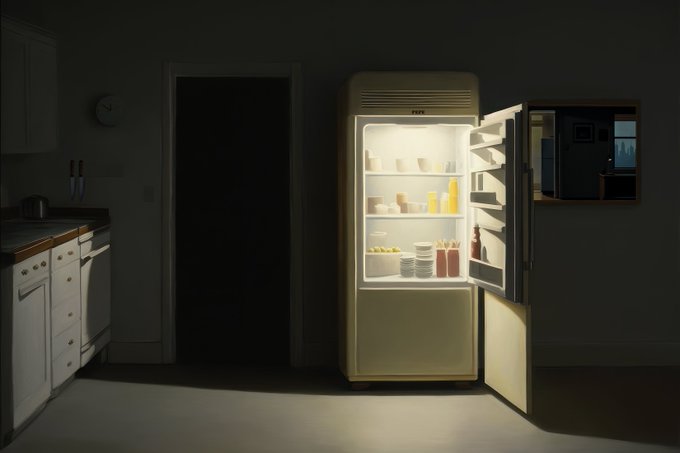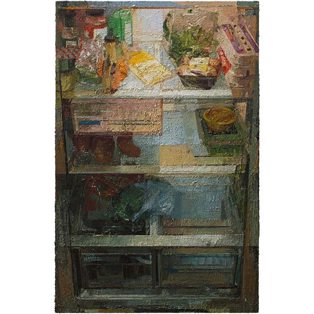 The refrigerator as artist muse - fascinating to see how different artists approach the same subject. My 1989 triptych "Evening Ritual," wonderful new digital work by @delta_sauce, paintings by @zoeyfrank and Antonio Lopez Garcia