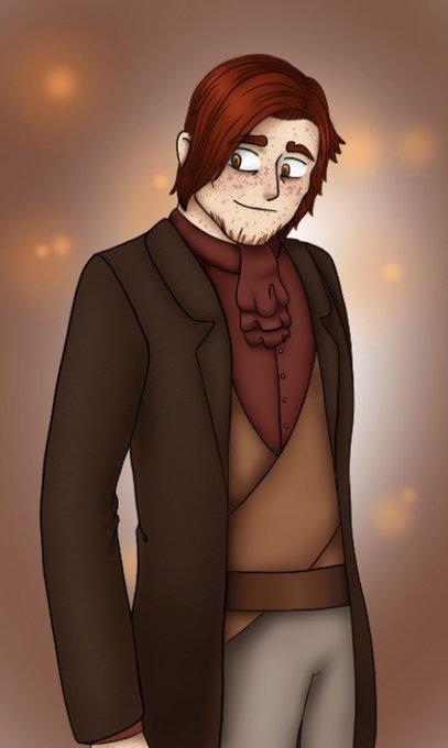 @ForbiddenSnacky @ace_of_dragons This is my fallen aasimar gunslinger, Icaelus Dydarion. His colors shift depending on his mental state, but when he’s doing well his hair is bright red, and his eyes and freckles glow with warm, amber light.