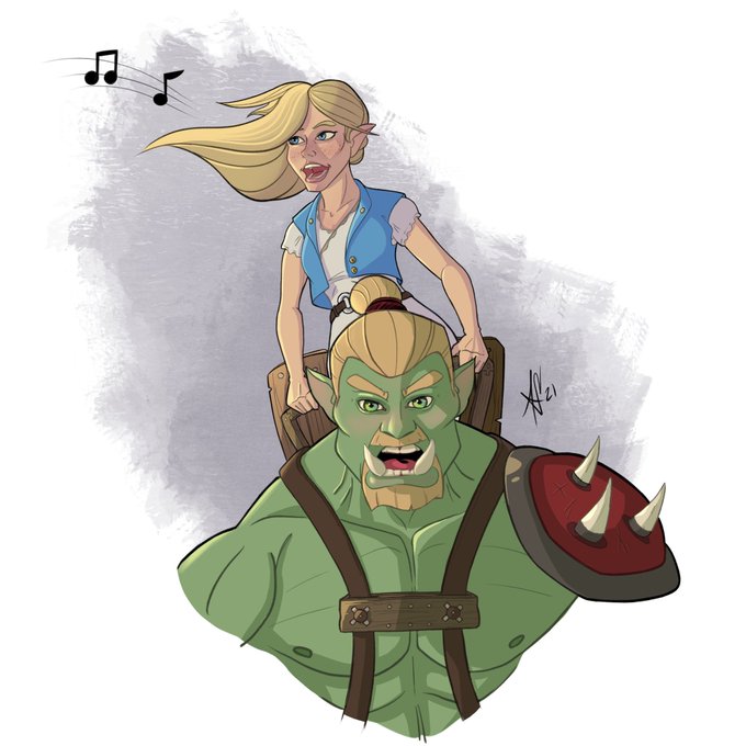 .@RRollplaying something like this. Gnome Bard Lily atop Orc Barbarian Uggo via harness. It’s been a while since I’ve done The Dungeon Run fan art! #thedungeonrun #fanart #dnd #ttrpg #fantasyart https://t.co/UDieRWwDKi
