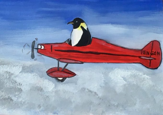 It’s #WorldPenguinDay here’s an oil painting I did of a Penguin flying a plane