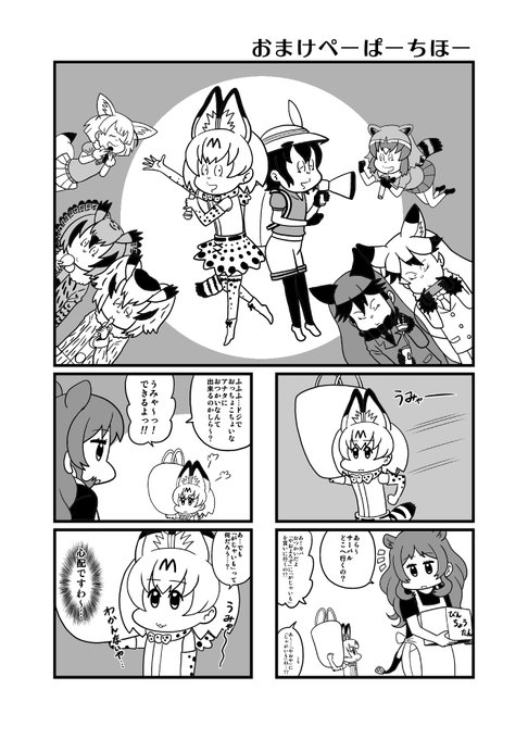 冬コミ・二日目東G47a・b「二丁目ベルハイツ」「ゴハン三世」にて委託の新刊『うみゃー』におまけペーパー付きます。4ページ漫画です。当日参加される方は是非お越しください。よろしくお願いします! #けものフレンズ