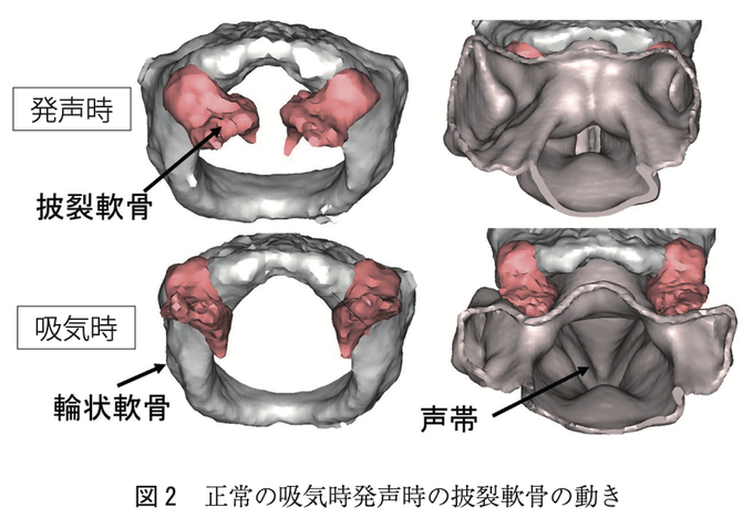 “注目すべきは筋突起の滑走回転運動は関節面の下方(尾側)で起きていて,上方には余剰な関節面のスペースがある”“高音発声時に披裂軟骨が頭側に移動することで→