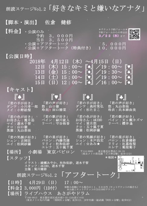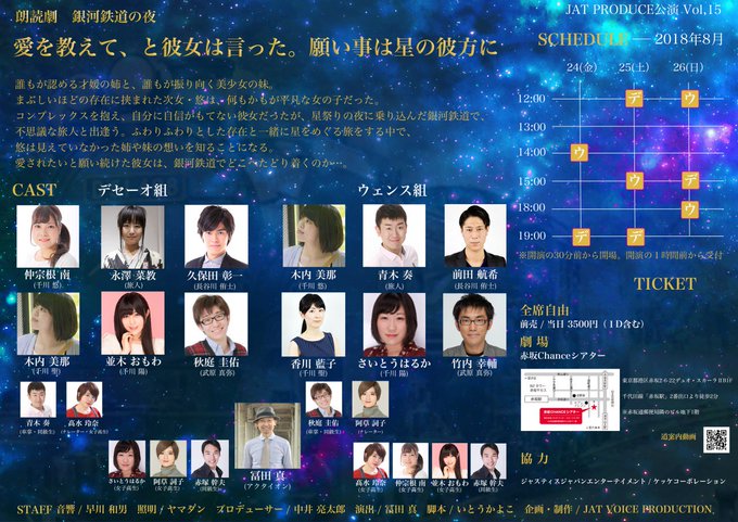 「銀河鉄道の夜~私たちは、夜空に瞬く夏のトライアングル」に続き、8月24~26日に朗読劇「銀河鉄道の夜」第2弾「愛を教えて、と彼女は言った。願い事は星の彼方に」を赤坂CHANCEシアターにて上演します。ご予約はこちらから