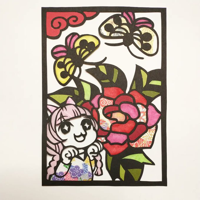 サブスク御礼切り絵、Evon(@evonsartcave)は牡丹に蝶🦋Thank you so much! 蝶を狙っている風にしてみたよ(ΦωΦ)牡丹は鮮やかで素敵だねぇ(ʘᴗʘ✿)