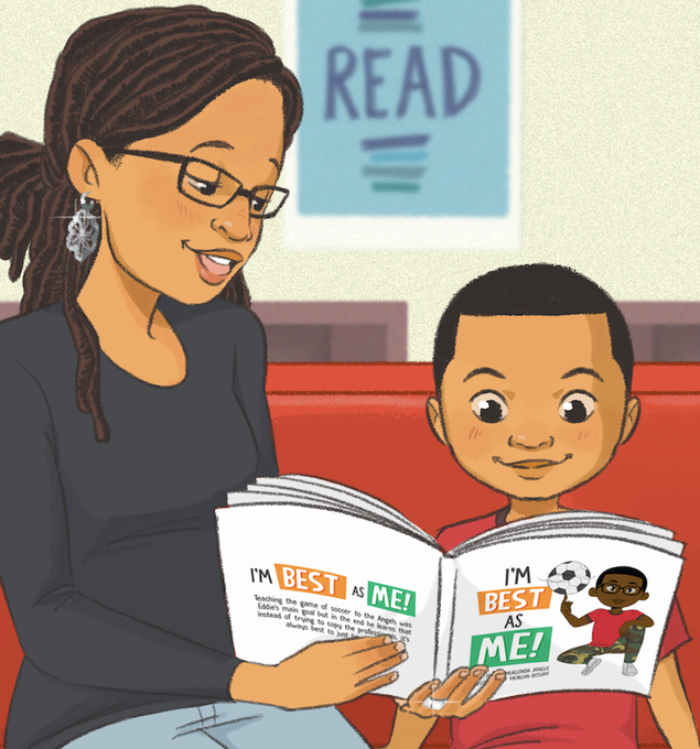 Time to read! Illustration of a friend and her son reading I'm Best As Me by Murlonda Janelle
