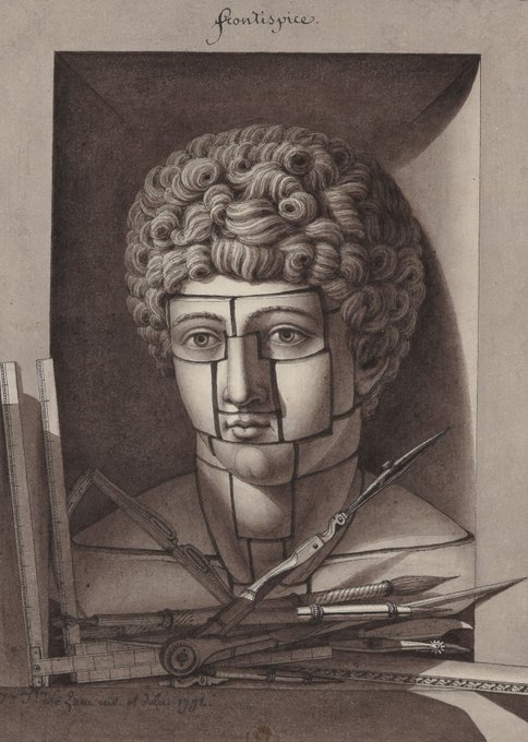 Jean-Jacques Lequeu (1757–1826) — Frontispiece to the New method applied to the elementary principles of drawing, tending to graphically prefect the outline of the human head by means of various geometrical figures. pen and black ink, gray wash, 1792