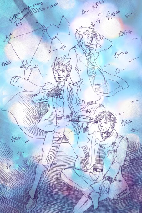 マシュマロにていただきましたお題「冬の星空を見上げるA木さんS田さん銀さん」描かせていただきました ありがとうございました~!