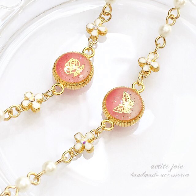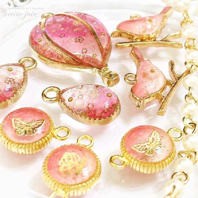 後ろの桜型はハンドメイドらぼ(@handmade_labo)様、前の桜パーツは(@Nakano_CA)様から購入後、少しだけレジンで色づけしました。