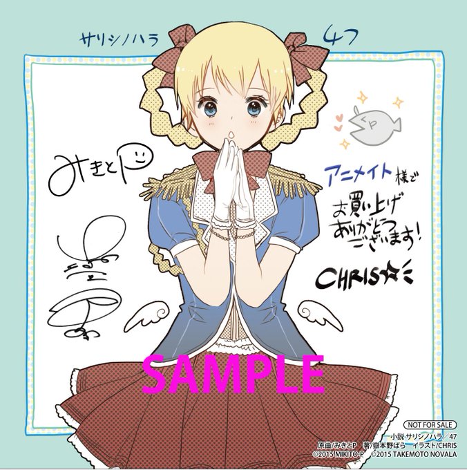 『小説サリシノハラ/47』の「面白かった!」等の感想ツイートに感謝! 大事にふぁぼらせていただいてます! ↓はアニメイトさん購入特典のみきとP×CHRIS×嶽本野ばらのサイン入りミニ色紙! http://t.co/fC6DlPKpuz