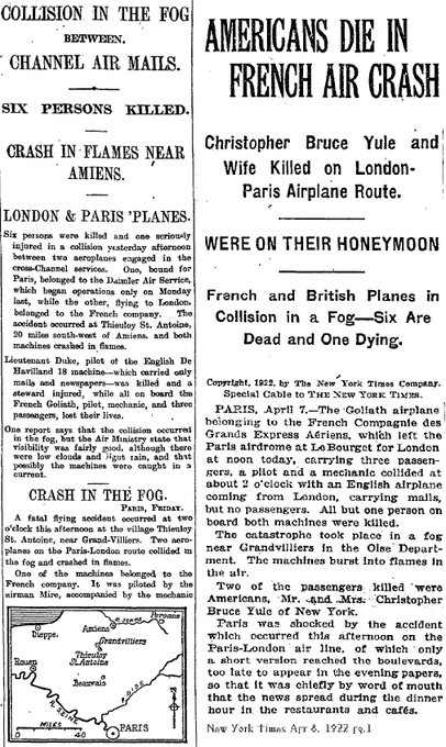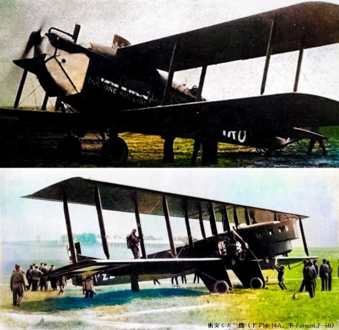 【百年ニュース】1922(大正11)年4月7日(金) ピカルディ空中衝突事故。ロンドン南部クロイドンからパリに向かっていた英国郵便配達機と,パリからクロイドンに向けて飛行中の仏国旅客機が,霧による悪天候のなか仏北部ピカルディ上空で衝突。7名全員が死亡。旅客機による初の空中衝突事故となった。