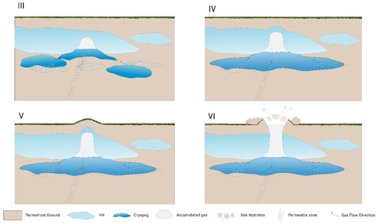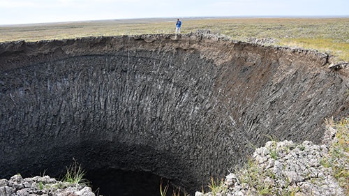 温暖化で空洞内の圧力があがり永久凍土が耐えられなくなって爆発してできるのが巨大なクレーター(下図)