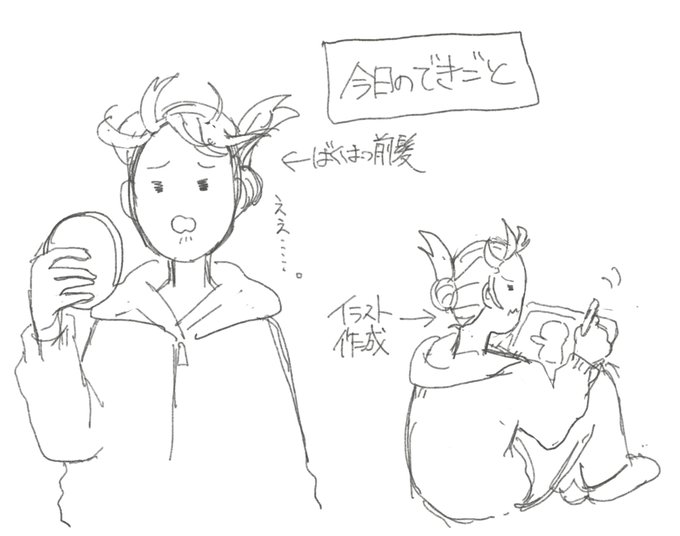今までの私の人生で見たことないくらい爆発していた前髪の寝癖に驚きつつ描きました💪