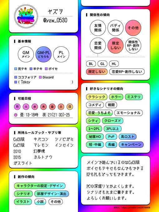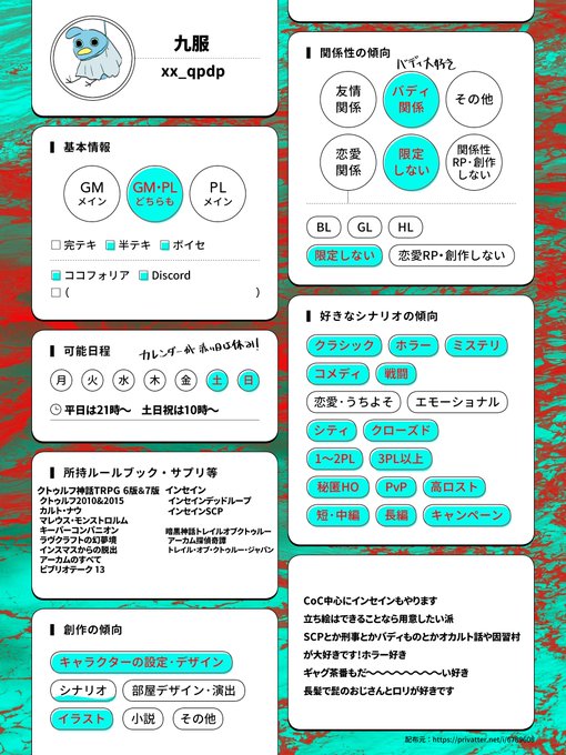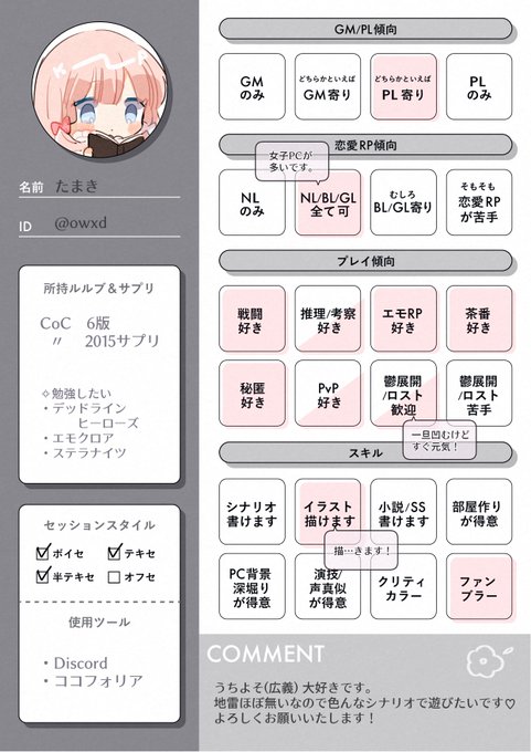 メインで遊んでいるのはCoC。立ち絵描いたり部屋作ったりシナリオをたまに書いています。