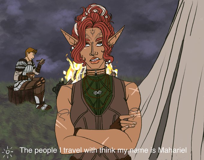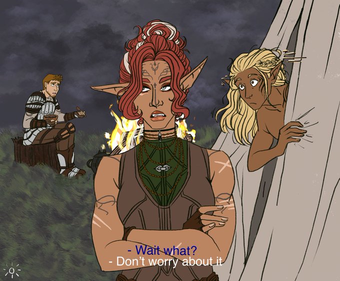 datura spent all blight not telling anyone her first name and then ashalle came to the post final battle party and blew it #dragonage #DragonAgeOrigins #mahariel #wardenmahariel #alistairtheirin #zevranarainai