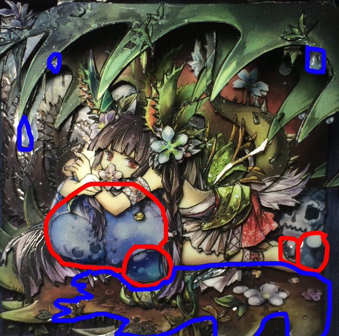 光沢の出し方は部分ごとに違っていて、例えば画像中の赤色で囲った部分にはレジンを使っています。一方、青色の部分は木工用ボンドを薄く塗って乾燥させることで光沢を出しています。